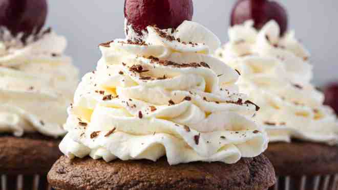 无麸质和无乳制品的黑森林纸杯蛋糕!这些纸杯蛋糕口感丰富,香甜可口。它们不仅外观精美,而且深受大家喜爱,所以别指望会有剩下的!