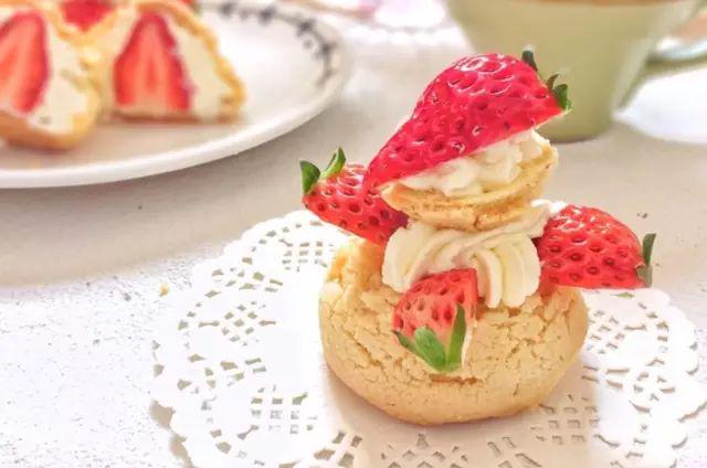7.把泡芙顶端切掉三分之一,挤入奶油,放上四块草莓,再将切下来的壳倒扣在奶油上,挤上适量奶油,放上一块草莓,就可以啦~