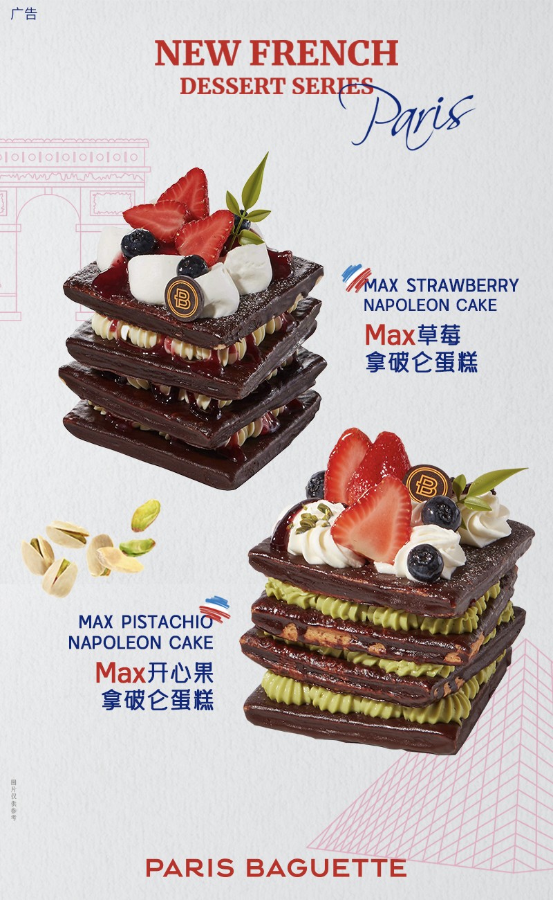 Max草莓拿破仑蛋糕,其外皮层层叠叠,酥脆可口,蓝莓酱与草莓酱的夹心则巧妙地交织在一起,果香充沛,清甜芳香的口味。Max开心果拿破仑蛋糕,其酥皮薄层恰到好处,搭配细腻丝滑的开心果奶油,奶香四溢、口感酥软。