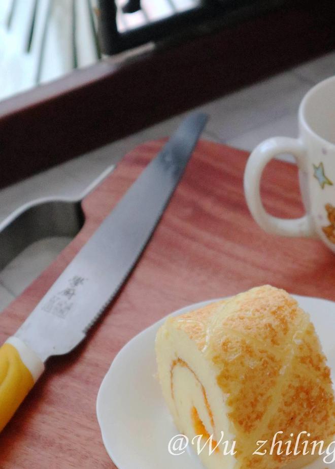 5、放入提前预热好的烤箱,烤熟取出放凉,翻过来抹上沙拉酱,放入咸蛋黄碎卷起定型2个小时即可。