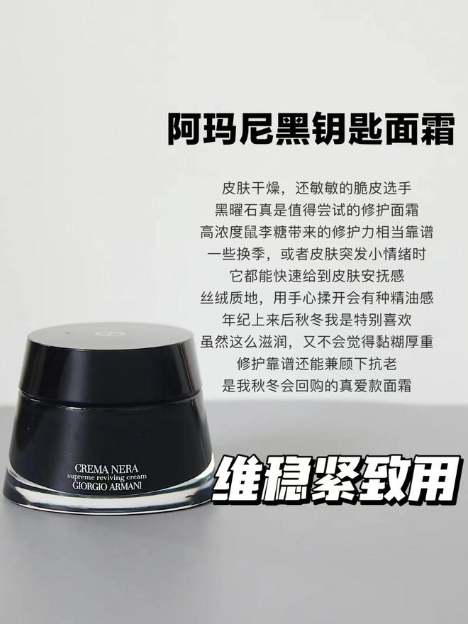 我的秋冬挚爱修宝就是阿玛尼黑钥匙,强修护+高滋润度真的给足了干敏肌安全感,我皮肤干燥红敏的时候就会拿出它急救,一个晚上就能让皮肤状态火速回升,第二天就能还你一个饱满细嫩的脸蛋儿。