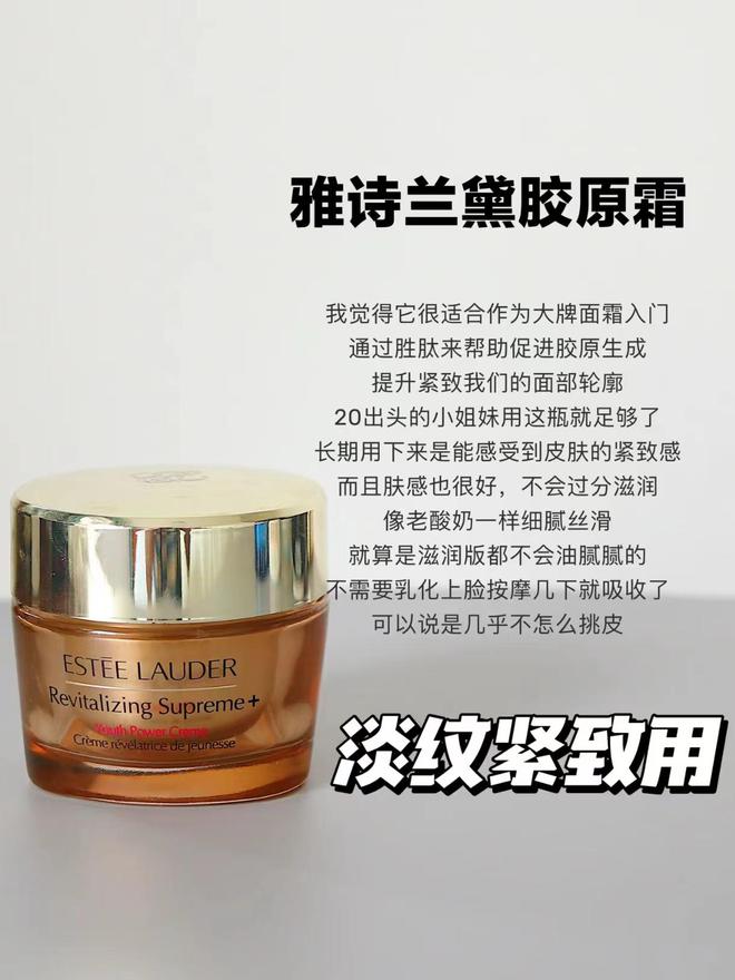 我觉得它很适合作为大牌面霜入门,通过胜肽来帮助促进胶原生成,提升紧致我们的面部轮廓,20出头的小姐妹用这瓶就足够了,长期用下来是能感受到皮肤的紧致感。