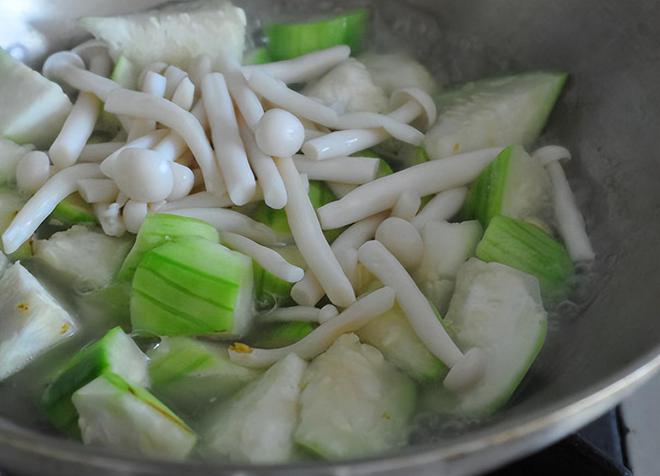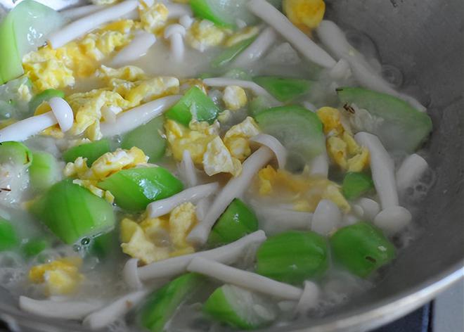 2,锅中加入食用油,油热后放入鸡蛋液,快速翻炒至凝固后,盛出来备用。接着放入控干水分的丝瓜炒匀,然后再加入白玉菇,翻炒至断生。